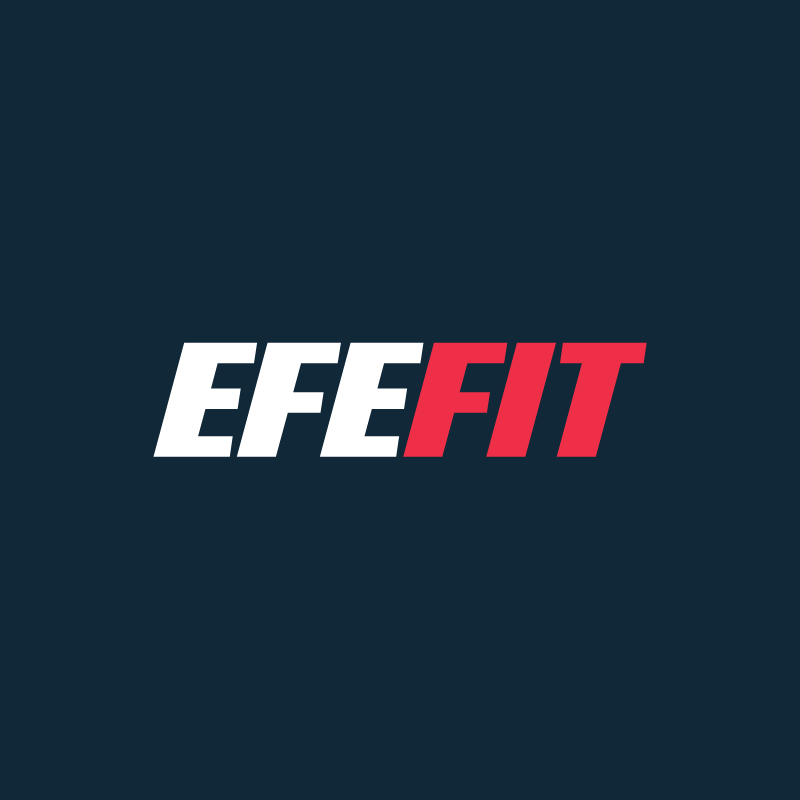 Logo EFEFIT – minimal-styl s dynamickým kontrastem (bílé vs červené písmo na tmavě modrém pozadí), vyvolávající energii, výkon, motivační efekt.